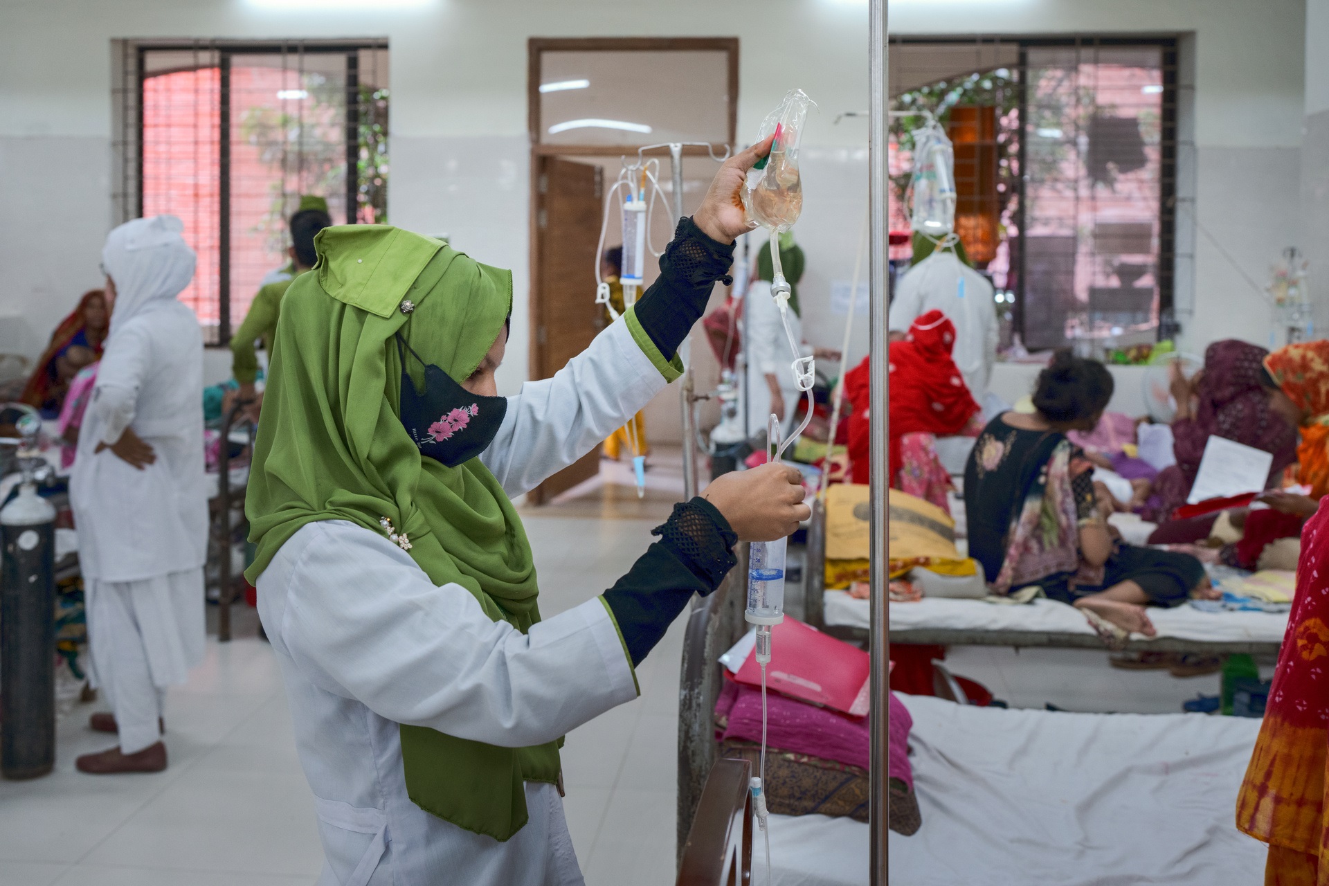 Nurse Akhter on duty in an inpatient area crowded with dengue patients at Suhrawardy Hospital in Sher-E-Bangla-Nagar, Dhaka, on 3 October 2023.