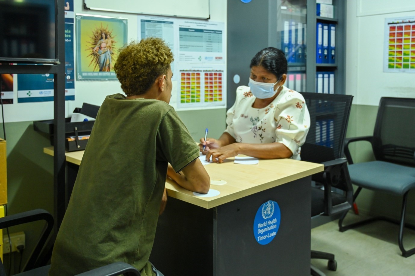 A young man talks to the health worker at Formosa tobacco cessation center. Photo: WHO Timor-Leste/Emilia Moniz