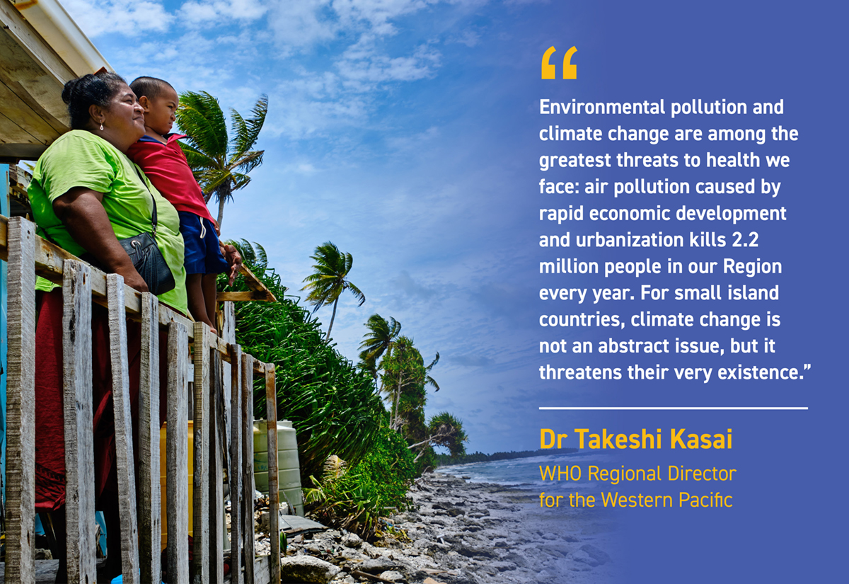 Every year, small island developing states (SIDS), including Pacific Islands countries and areas, make up two thirds of the countries in the Western Pacific Region that suffer the highest relative losses from disasters. Rising sea levels and increasing tropical storms are reducing access to fresh water, degrading beaches and reefs, taking the land where homes and hospitals once stood, and, ultimately, threatening the lives and livelihoods of the people in the Pacific.